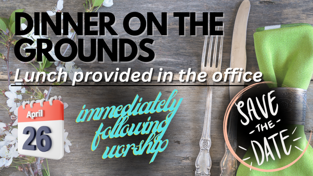 Join us in the office after worship Sunday, April 26th for “Dinner on the Grounds.” Instead of rushing through a drive through, or waiting at a restaurant, why not take the short walk to the office, let us feed you and enjoy the company of your fellow church members?