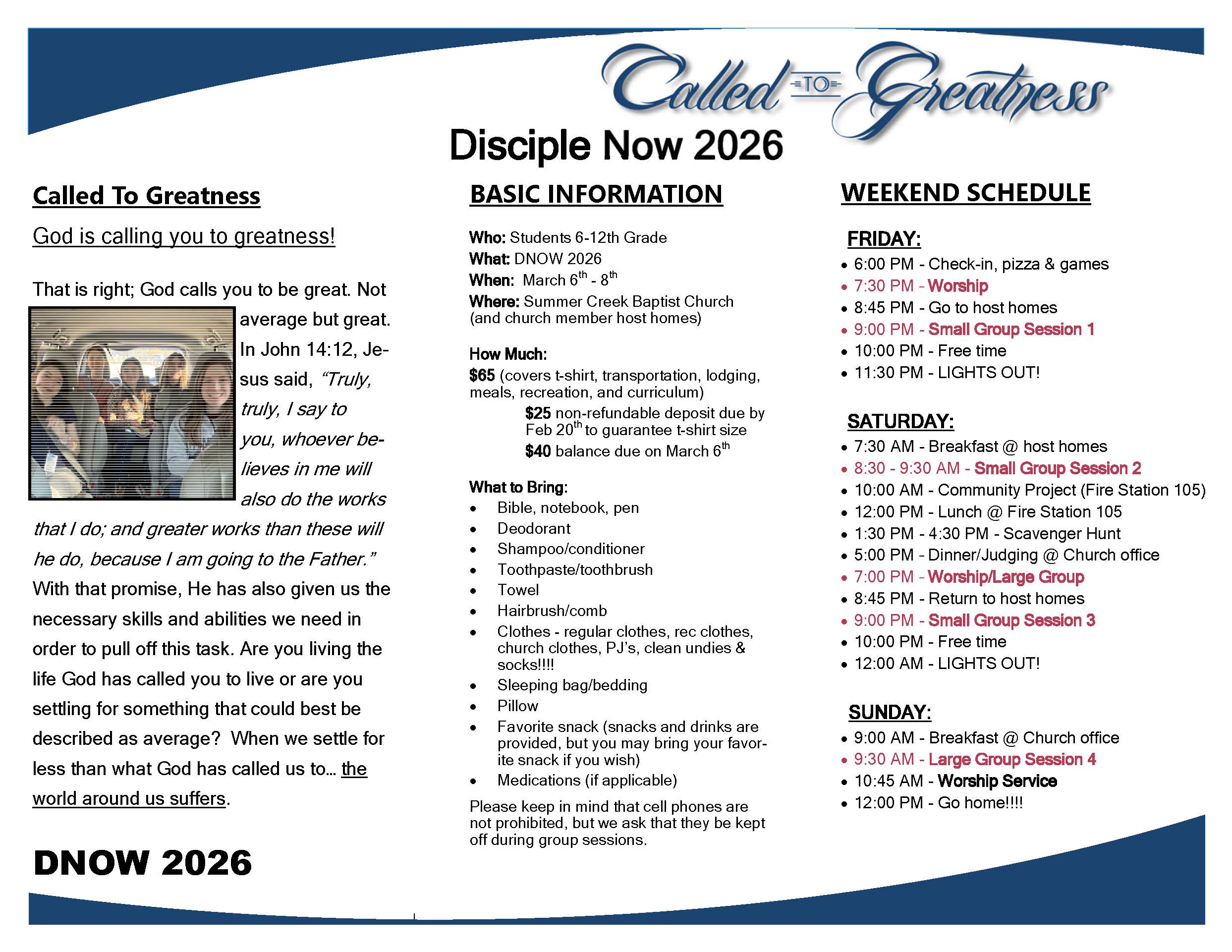 Disciple Now (DNow) is a weekend retreat for students filled with worship, bible studies and fellowships. Students stay at member host homes. Click below for a snippet from last year’s DNow.